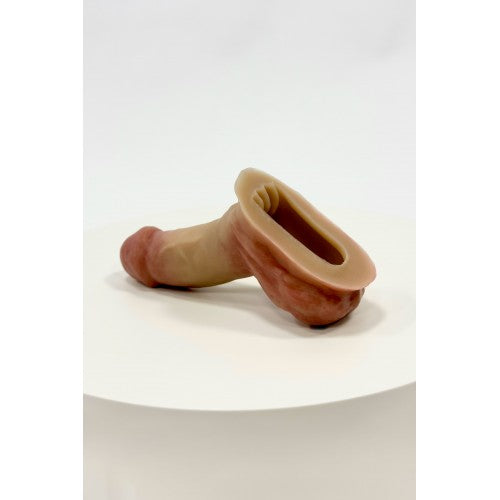 Packer con 5 funciones: Penetración (sexo), Volumen en ropa interior, Orinar, Proporcionar placer durante las relaciones sexuales, Masturbador. Hecho de silicona grado medico que imita la piel humana. Es extremadamente suave y maleable por lo que se puede colocar de diferentes formas. Para sexo simplemente ajustar las vertebras y se recomienda usar con arnés o bóxer especial para packer. Este packer incluye vertebra azul, la cual permite orinar sin quitarla. 10 cm penetrables, 3.5 cm de diámetro, peso 160 gr.